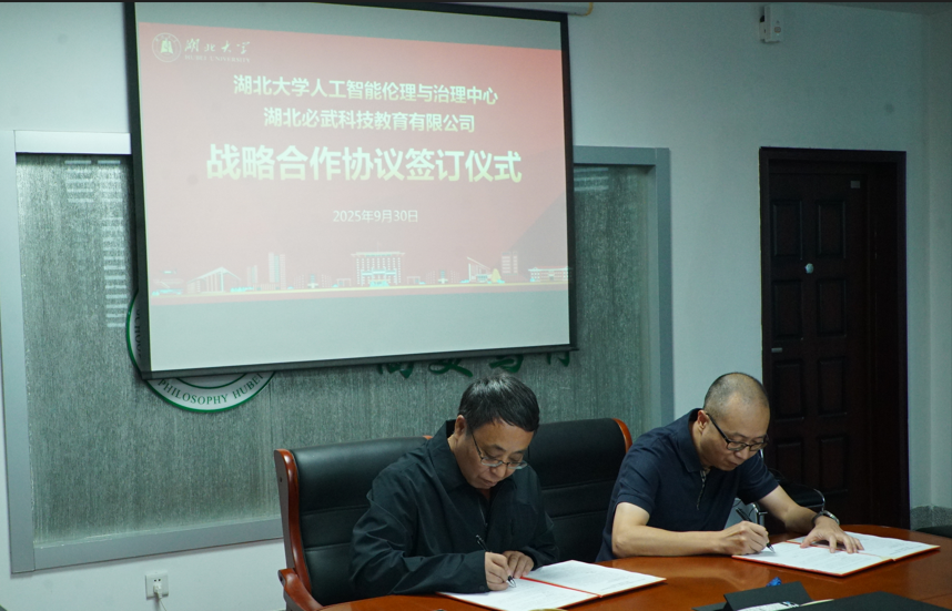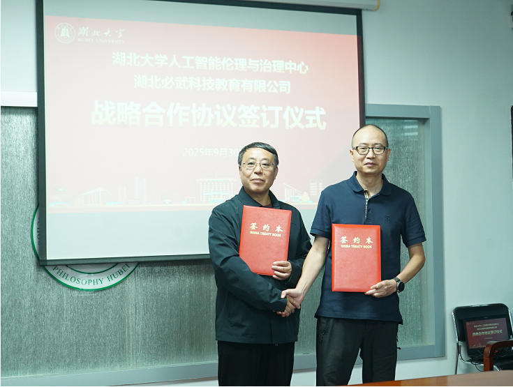 2025年9月30日,湖北大学人工智能伦理与治理中心与湖北必武科技教育有限公司签订战略合作协议,双方同意一道探索智能时代的教育工作新模式,推动湖北大学哲学学院校级协同共同发展。