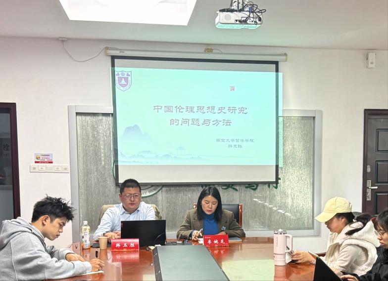 11月12日上午,哲学学院在逸夫楼D3008举办了一场题为《中国伦理思想史研究的问题与方法》的学术讲座,特邀南京大学哲学学院副教授韩玉胜主讲,李婉芝老师主持,部分学生代表到场参与,共同探讨中国伦理思想史的学术脉络与研究路径。