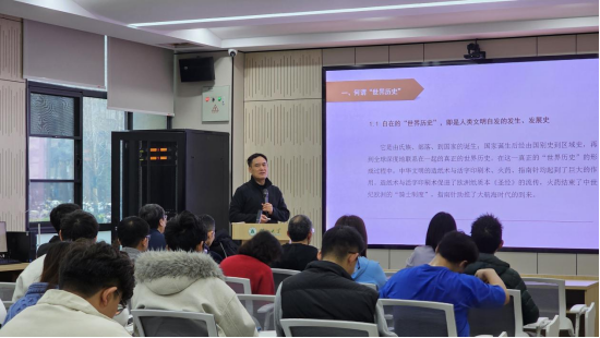 讲座中,吴根友教授以马克思主义历史哲学为视域,系统梳理了“世界历史”从“欧洲时刻”“美欧时刻”到“世界历史中国时刻”的演进脉络,解读了人文精神的中国声音。他表示,“中国时刻”是责任担当,在世界百年未有之大变局加速演进背景下,可为世界提供更具包容性的“中国方案”。吴根友教授还以赵汀阳著作《天下体系》与陈赟著作《文明论的历史哲学》为例,剖析了中国学者在政治哲学与历史哲学领域的理论回应,为“中国时刻”的精神自觉提供了重要启示。整场报告围绕“中国时刻”的责任内涵、物质与精神的辩证关系、天下观与民生的现实关联展开,体现了人文学科回应时代命题的思辨深度与人文关怀。